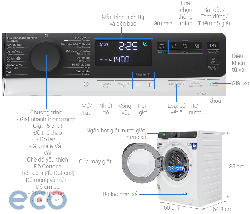 Tiện ích | Điều khiển từ xa, xả thêm, khóa trẻ em, lưu chương trình yêu thích |