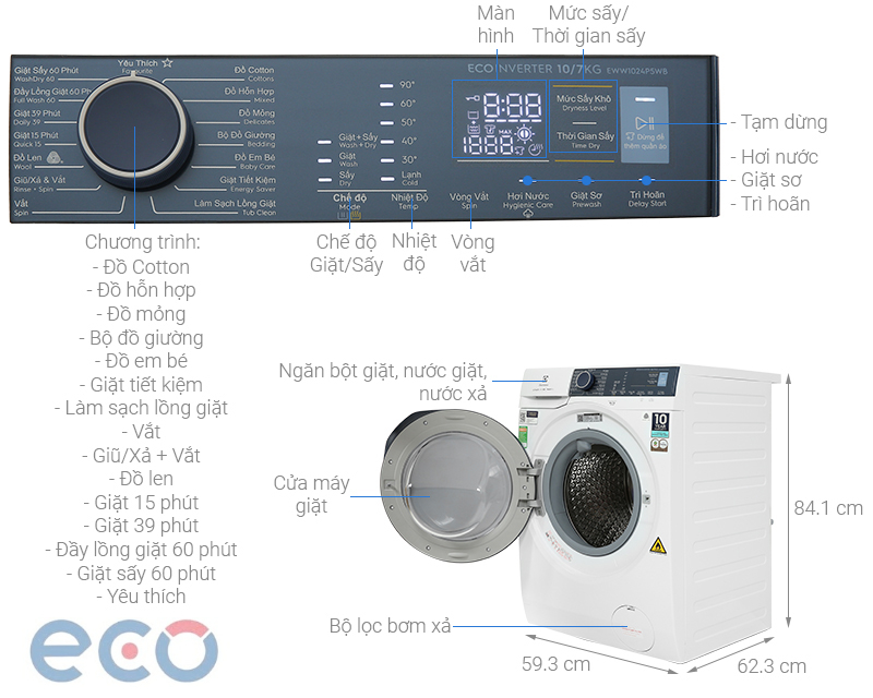 Chương trình giặt | 15 chương trình (Giặt nhanh, Đồ cotton, Đồ trẻ em, Vệ sinh lồng giặt, Giặt tiết kiệm, v.v.) |