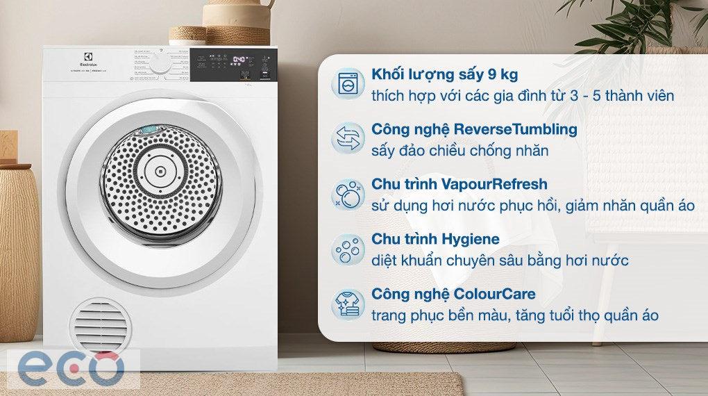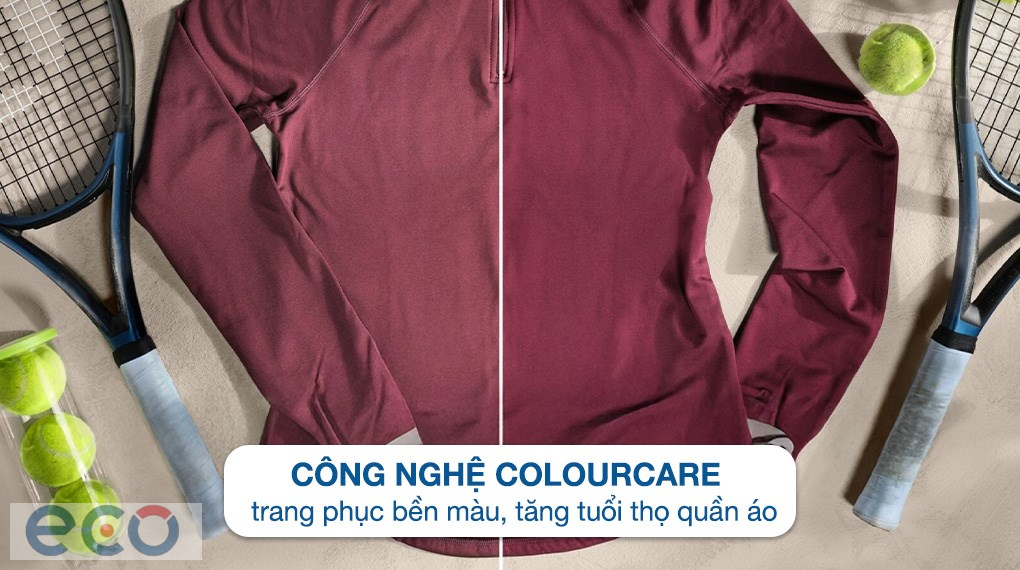 Máy tích hợp công nghệ ColourCare giúp bảo vệ màu sắc và chất liệu sợi vải trước tác động nhiệt. Reverse Tumbling sấy đảo chiều làm giảm nếp nhăn và xoắn rối, trong khi HygieneCare loại bỏ vi khuẩn, an toàn cho làn da nhạy cảm. Vapour Refresh sử dụng hơi nước để làm mới quần áo và giảm nhăn nhanh chóng.