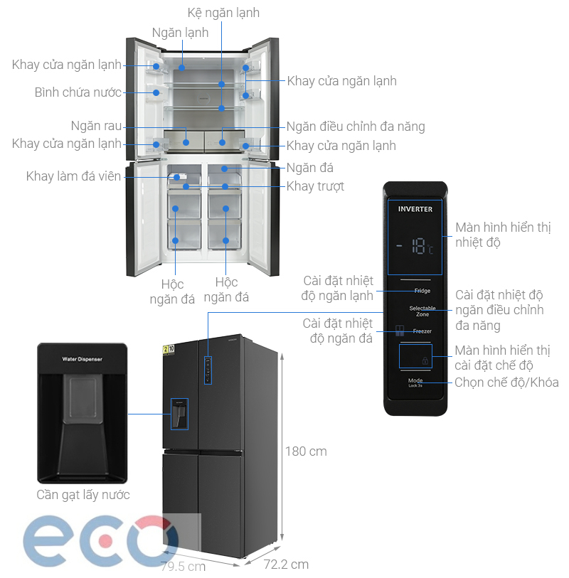 | Tiện ích | Lấy nước ngoài, Đèn LED chiếu sáng, làm lạnh nhanh, Khóa trẻ em, hộp đá xoay di động, Bảng điều khiển cảm ứng bên ngoài cửa tủ, làm đông nhanh |
