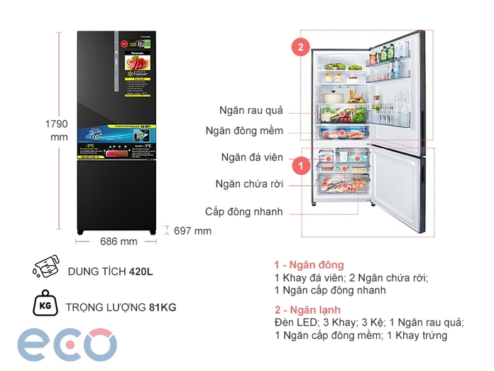 Cảm biến Econavi: Tủ lạnh được trang bị 4 cảm biến thông minh giúp nhận diện điều kiện môi trường và thói quen sử dụng để tự động điều chỉnh nhiệt độ phù hợp. Điều này giúp giảm thiểu sự lãng phí năng lượng.