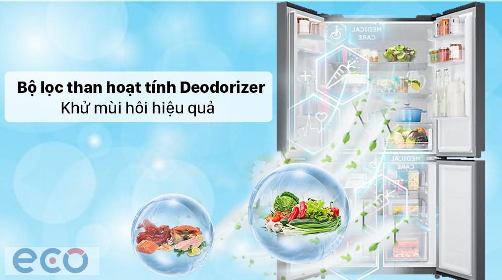Bộ lọc than hoạt tính giúp loại bỏ mùi hôi khó chịu, giữ cho không khí bên trong tủ luôn sạch sẽ và trong lành, giúp thực phẩm không bị ám mùi, đồng thời ngăn chặn vi khuẩn phát triển, bảo vệ sức khỏe gia đình.