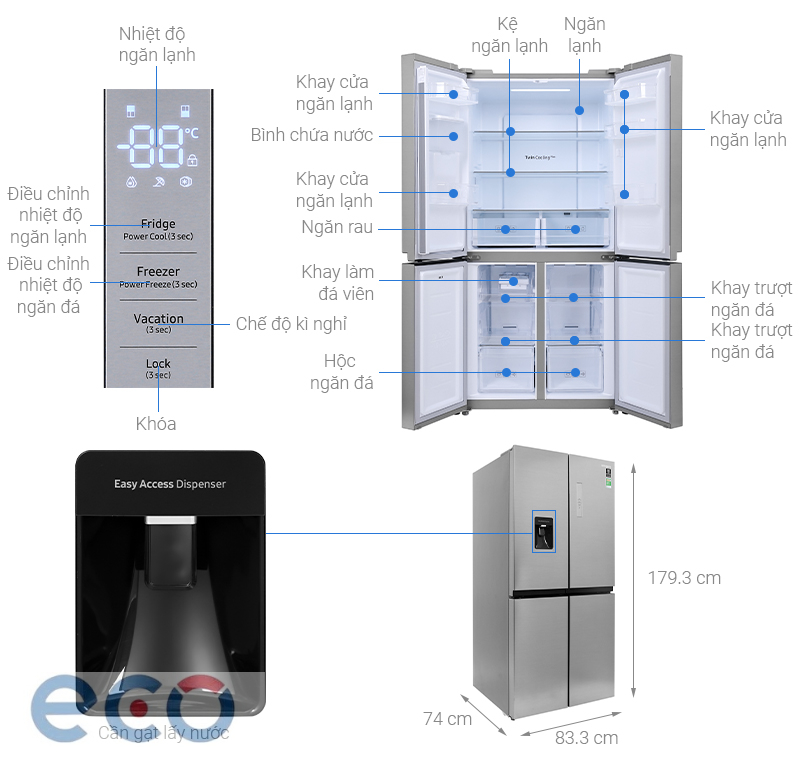 Thiết kế 4 cửa tiện lợi: Với 4 cửa riêng biệt, người dùng có thể lấy thực phẩm dễ dàng mà không làm thoát hơi lạnh quá nhiều, giúp tiết kiệm điện năng và duy trì nhiệt độ ổn định bên trong tủ.