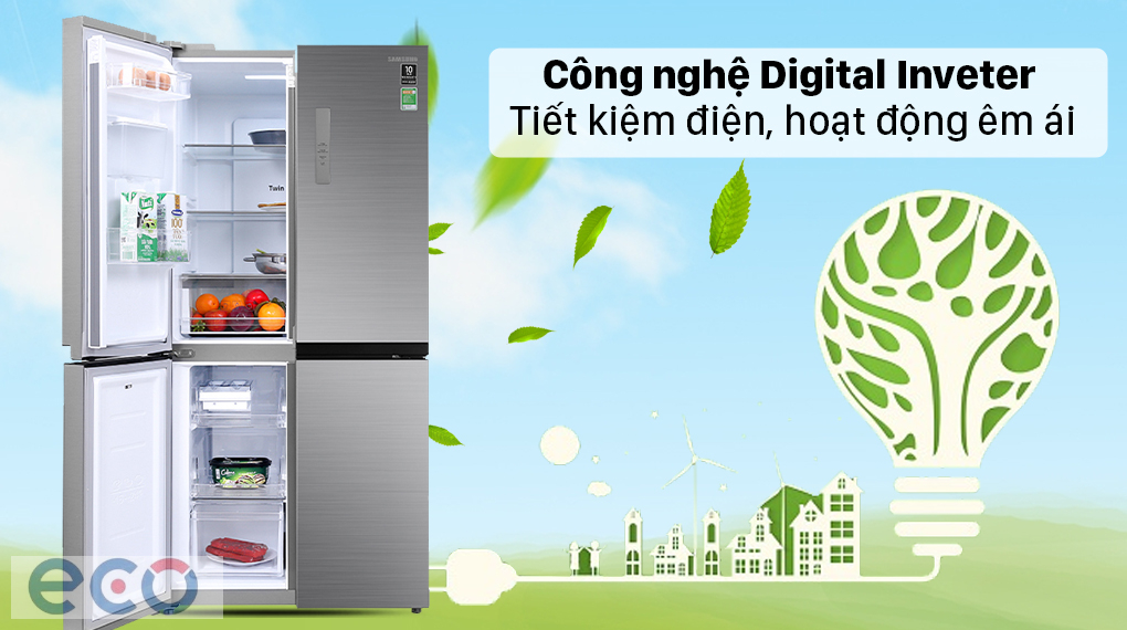 Tủ lạnh Samsung RF48A4010M9/SV được trang bị công nghệ Digital Inverter, tự động điều chỉnh tốc độ máy nén tùy theo nhu cầu làm lạnh. Điều này không chỉ giúp giảm tiêu thụ điện mà còn kéo dài tuổi thọ máy nén và giảm tiếng ồn khi hoạt động với mức tiêu thụ điện chỉ 458 kWh/năm.